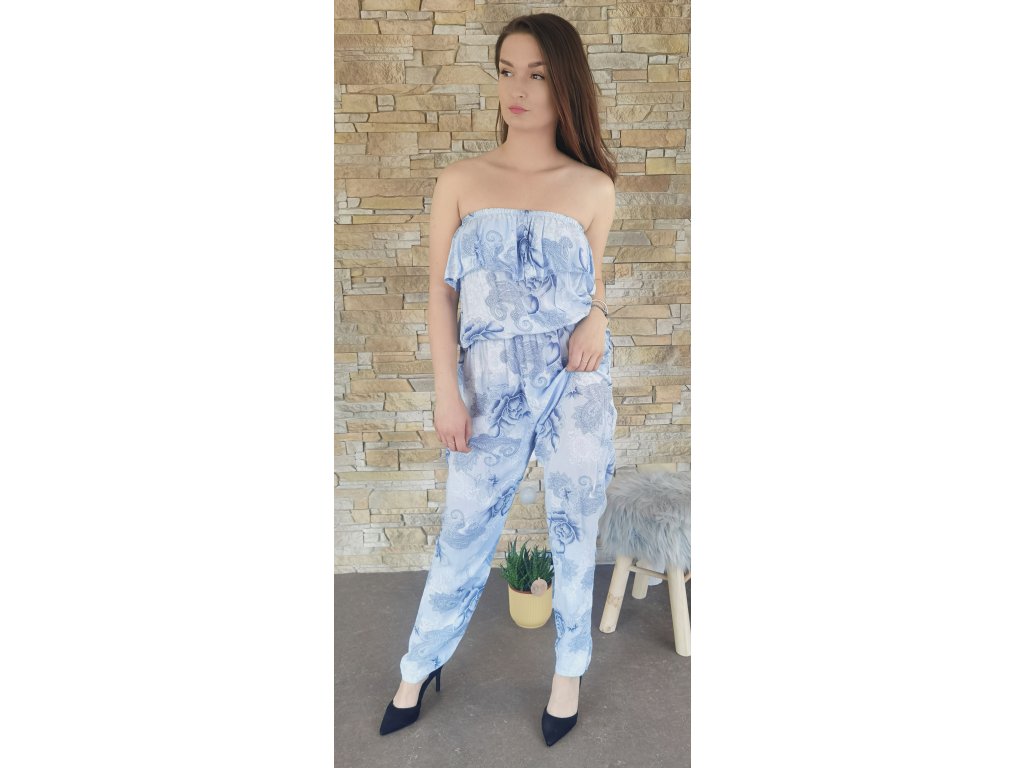 Dámský letní overal z velmi lehkého a příjemného materiálu. V pase je pružná gumička, díky které vypadá pas štíhlejší.